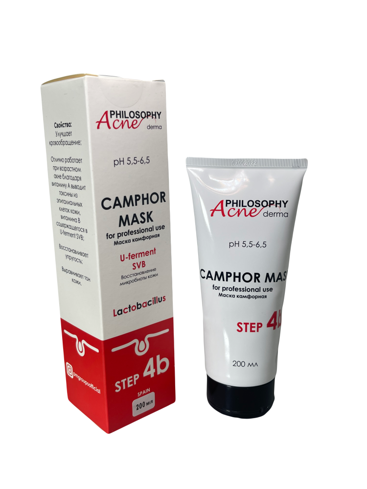 Применяется при розацеа и угревой болезни. Маска наносится на очищенную кожу, экспозиция 15-20 минут, после чего ее необходимо смыть водой. После снятия маски может ощущаться легкое чувство онемения кожи. Камфорная маска может применяться самостоятельно 1 – 2 раза в неделю, и в составе различных протоколов лечения вышеуказанных патологий.